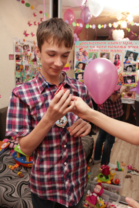 Это я проводила конкурс "Самый быстрый" (на скорость двоим участникам нужно было выпить бутылочку с соской, наполненную соком). Победителю медаль и сладкий приз!