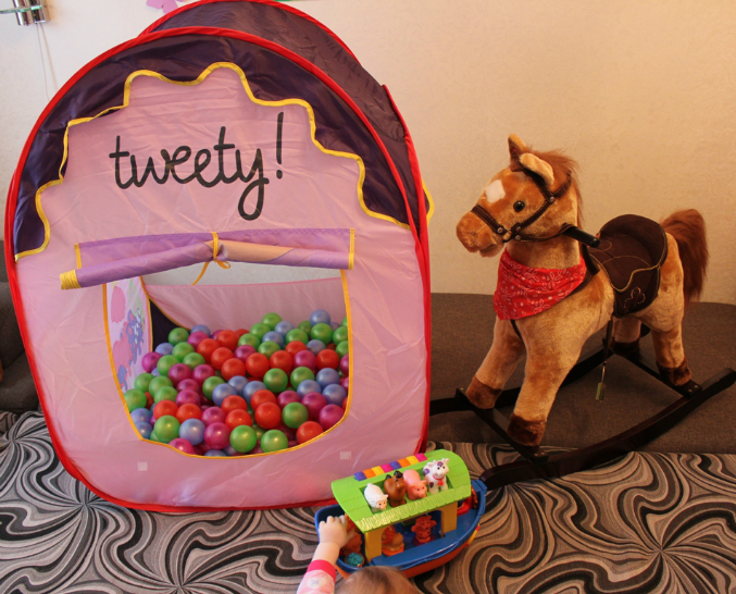 Палатка с шариками от крестной, лошадь-каталка от моей сестры (лошадь игогочет, шевелит ртом и хвостом); Ноев ковчег от моей подруги.