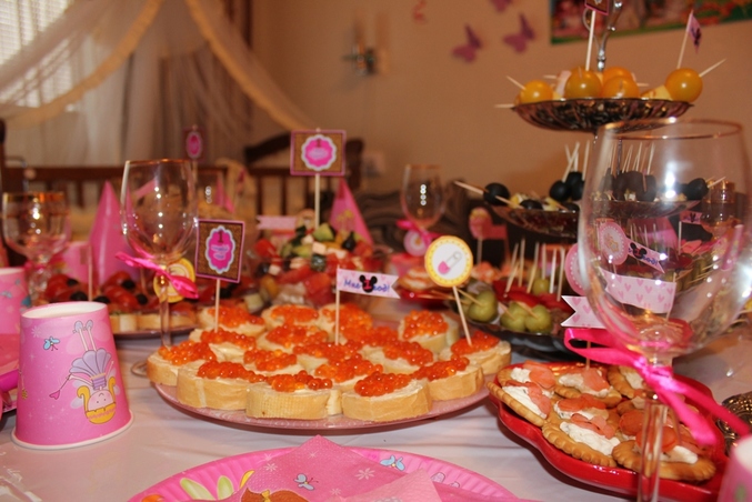 Во всех салатах и во всех угощениях вставляла разные таблички "Это вкусно", "Это стоит попробовать" и тд. Были флажки "Мне 1годик" и просто детские картиночки на палочках:)