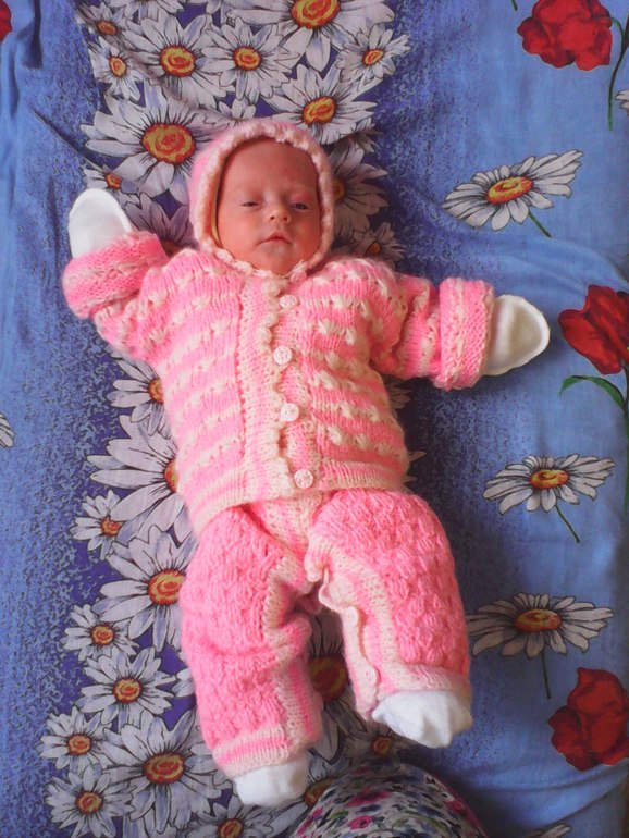 посмотрим, может и правда смесью подкармливать. Были у кардиолога, записали на ЭКГ 11 марта. Так наш дефект не прослушивается, если и на ЭКГ все хорошо будет то контроль только в полгода. Кровь брали на железо(чтобы препарат выписали) а результаты хорошие, так что не дадут рецепт.. Ну и ладно)) на глазике так пятнышко и не проходит... Однако родимым так и останется...Все никак не могла похвастаться нашей одежде, моя мама связола нам комбез, который можно превратить в конвертик