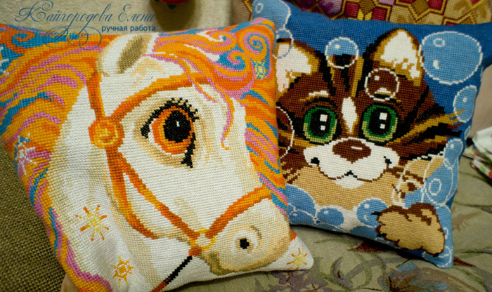 Хочу похвастаться работой моей мамы - она вышивала для малыша такие подушки. На каждую ушел ровно месяц.