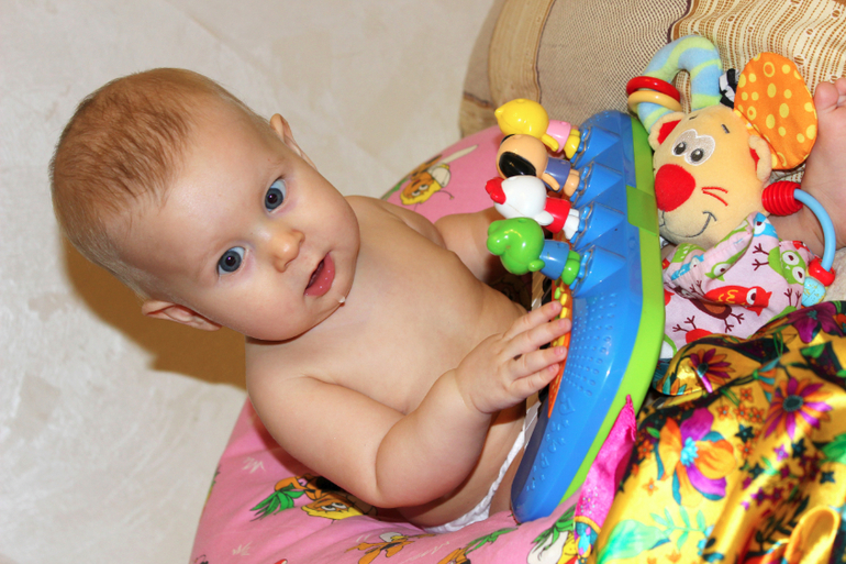 Очень оценил пианинко! И вообще очень любит всевозможные технические штуки! Пульты, фотоаппарат, телефоны, игрушки-шумелки, с кнопками, огоньками... До трясучки тянется и хватает салфетки, если протираю ему лицо и ротик, забираю, потом долго рыдает! И вообще рыдает по любому поводу! Утром нарезала огурчиков полосочками, оба детеныша любят, сложила на пластиковую подставочку, поставила перед Гошей, он копается, мусолит, Женечка периодически подбегает и берет ломтик. В итоге они потянулись за одним ломтиком, первой взяла Женя! И всё... орал дурниной до красноты, психанул, перекинул все остальные огурцы, дальше есть-сидеть-играть отказался наотрез. Во дает!