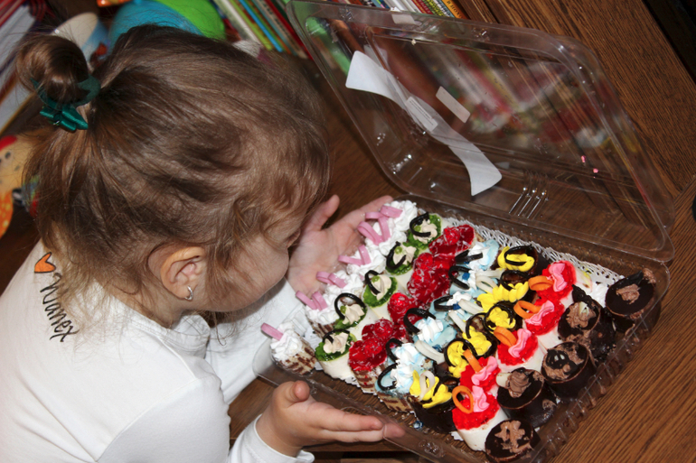 Вчера мы вместо именинного тортика возжелали именинные пирожные!))) Объела именинница украшения с пирожных и все))) Но была очень счастлива! Теперь она на площадке с гордостью сообщает, что ей четыре с половиной года!))
