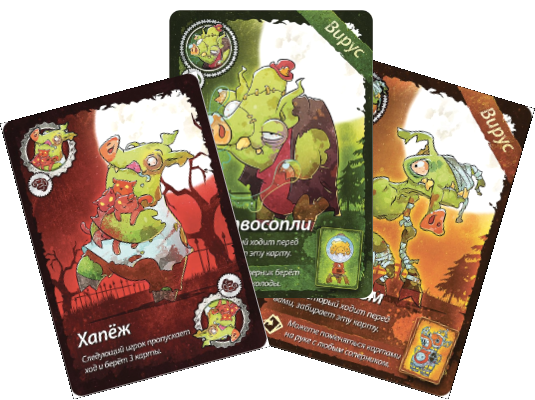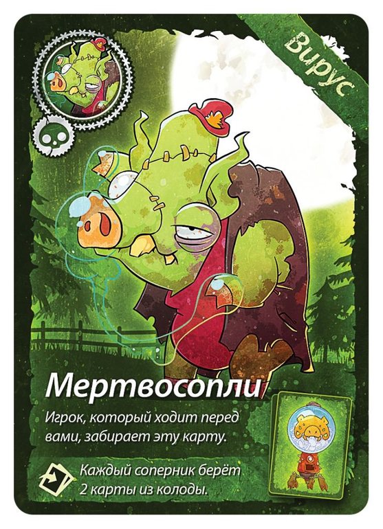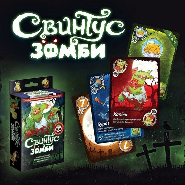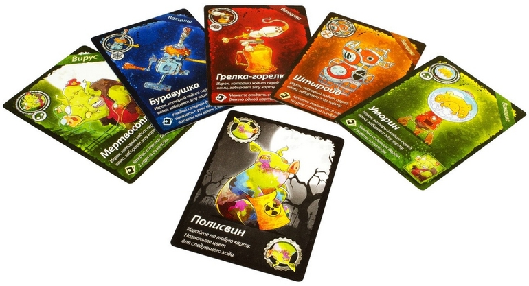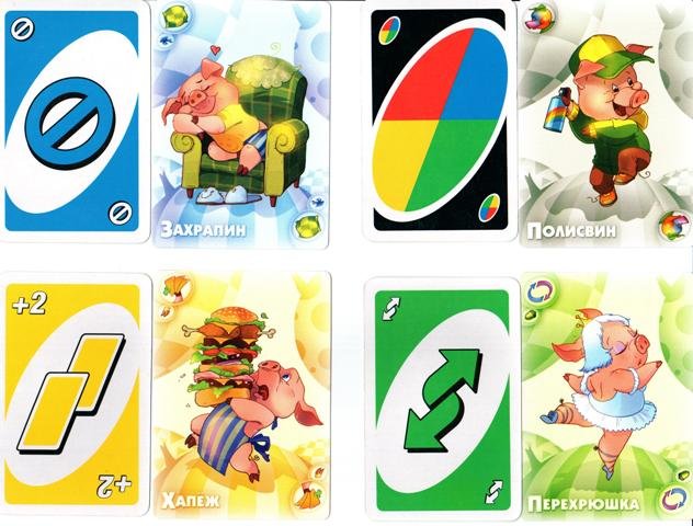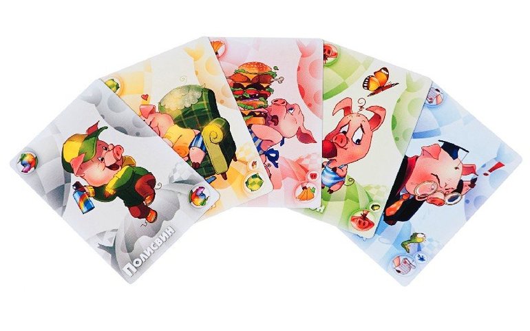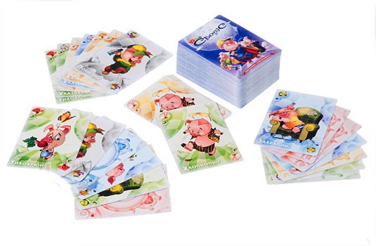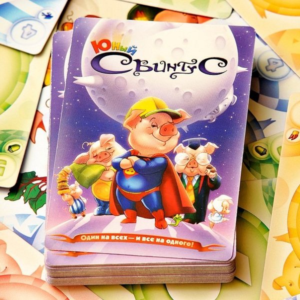 Цель игры предельно проста - избавиться от всех своих карт. Справиться с этой задачей вам поможет команда суперсвинтусов: молниеносный Хлопкопыт, загребущий Хапеж, вертлявая Перехрюшка, невозмутимый Захрапин, цветопомрачительный Полисвин, таинственный Тихохрюн и суровый Указявка. В отзывах люди пишут, что эта игра веселее чем Уно. Посмотрим.