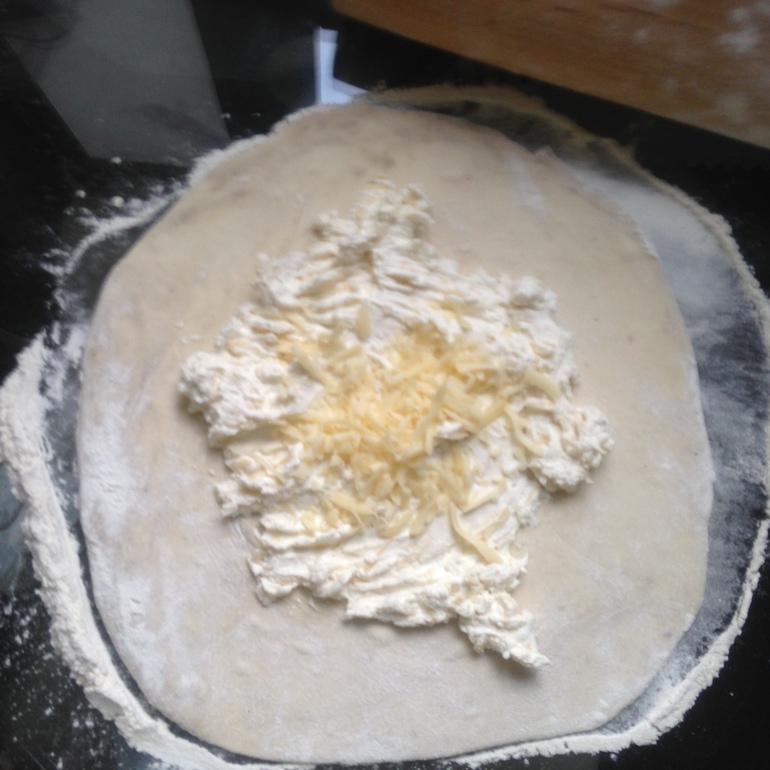 Дома ничего нет. В выходные в магаз не ходили и все съели. Есть кусочек теста, творог и сыр. Сделаю хачапури. Обычно завтрак у нас более здоровый, но правда больше ничего нет)