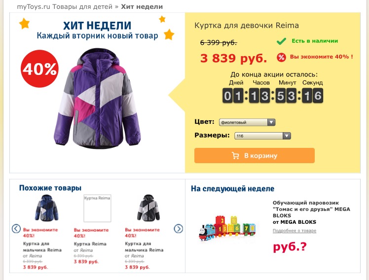 Скидка недели на двустороннюю куртку. Разные расцветки и размеры. Дополнительно можно использовать купон на 400-500 руб для первого заказа (промокоды можно взять в разделе Скидки mytoys на ББ). Есть бесплатные ПВЗ в Москве. Ссылка
