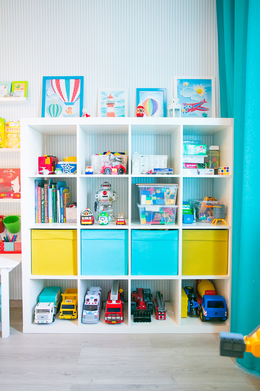 Отдельно остановлюсь на организации хранения игрушек. Многие родители боятся беспорядка в детской, отдавая предпочтение закрытым шкафам и комодам. Еще я слышала мнение о том, что вот пыль потом вытирать замучаетесь. Ерунда это и оправдания для ленивых)) Я считаю, что ребенка с малых лет нужно приучать к порядку. Причем не методами гастапо, а собственным примером. Сначала малыш привыкает к окружающему его порядку, потом начинает принимать участие в его наведении. Складывать игрушки на открытые полки проще и быстрее.