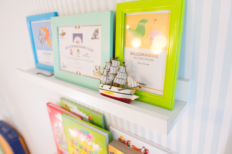 Важным атрибутом были игрушки и полки с книгами. Такой способ хранения книг я нахожу замечательным: ребенку удобно выбирать, что почитать, а мне - красиво) Конечно, на этих полках стоят самые любимые и читаемые в настоящее время книги.