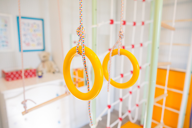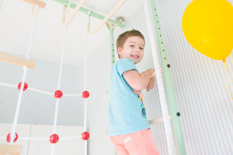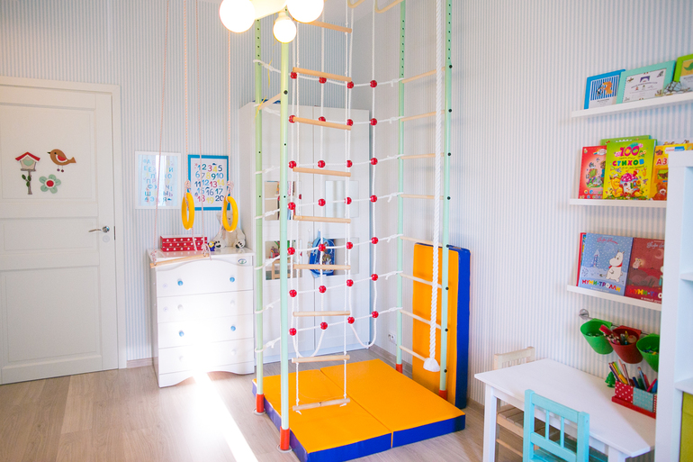 С самого начала я не представляла детской комнаты для мальчика без спортивного комплекса. И хотелось не просто шведскую стенку, а что-то более интересное. Все подобные ДСК как правило устанавливаются враспор между полом и потолком, а значит никакого гипрока или натяжных потолков. Но проводку-то прятать надо..? Решение было выбрано следующее - создать небольшую конструкцию из гипсокартона, оставив свободной ту часть потолка, где будет стоять комплекс. Заодно мы решили проблему освещения в детской: не хотелось больших многорожковых люстр, хотелось чего-то необычного и интересного. Такие светильники обычно рассчитаны на небольшое количество ламп,в нашем случае - на 3. Этого было явно недостаточно для нашей 14-метровой детской. Пять встроенных светильников решили проблему.