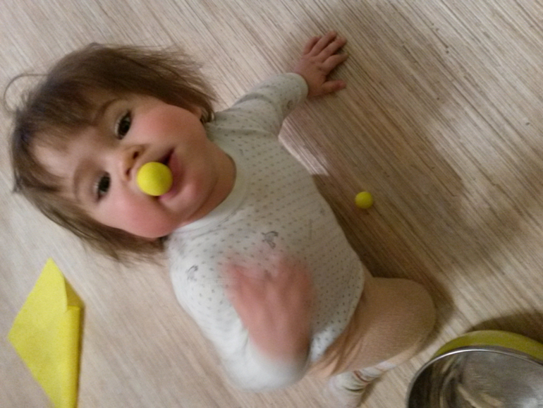 Ну и напоследок мы собирали гусеницу (мама собирала, дочь пробовала на вкус) и складывали всё что было дома желтого цвета в таз (тоже желтый). Особенно ребенок оценил лимонницу, желтые шарики,тряпку и конечно сам таз