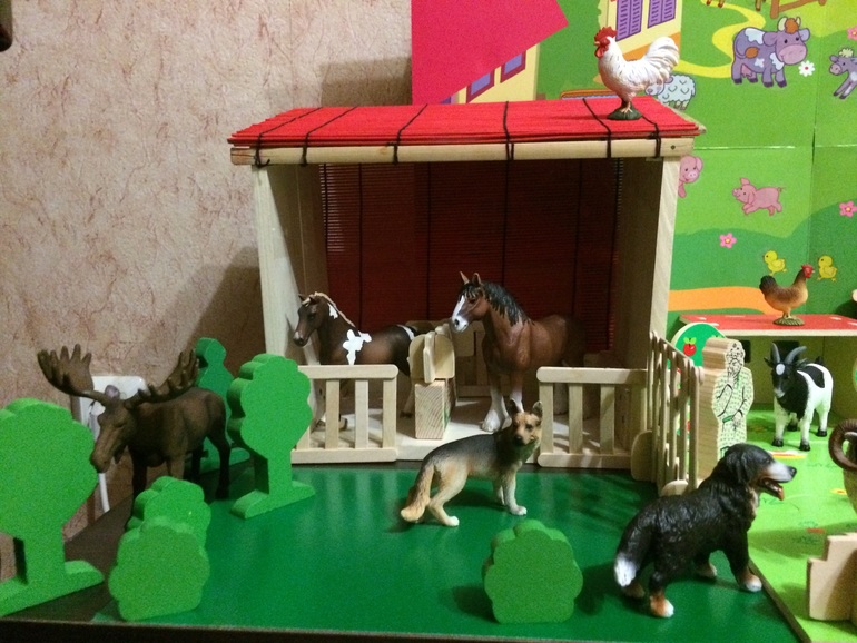 Наконец то я нашла время, чтобы создать площадку для игры ребенка. Нам еще только полтора года, но уже есть любимые игрушки -собака, лошадь))) коллекция безусловно будет дополнена коровами, свиньями, козой, ну, и теми животными, которые подмигнут мне с полки магазина))) Конюшня сделана собственноручно. Игрушки разных фирм ( schleich, mojo и какая то без фирменная фирма). Наслаждайтесь!