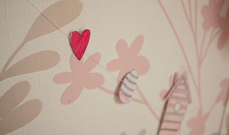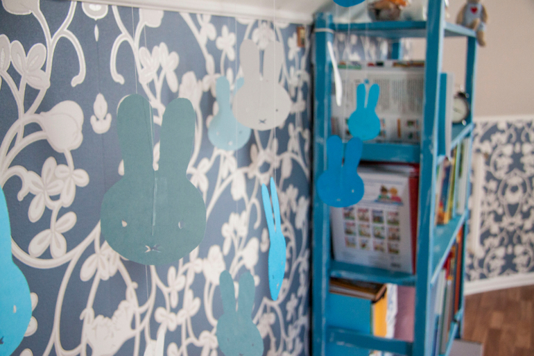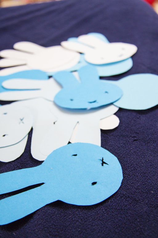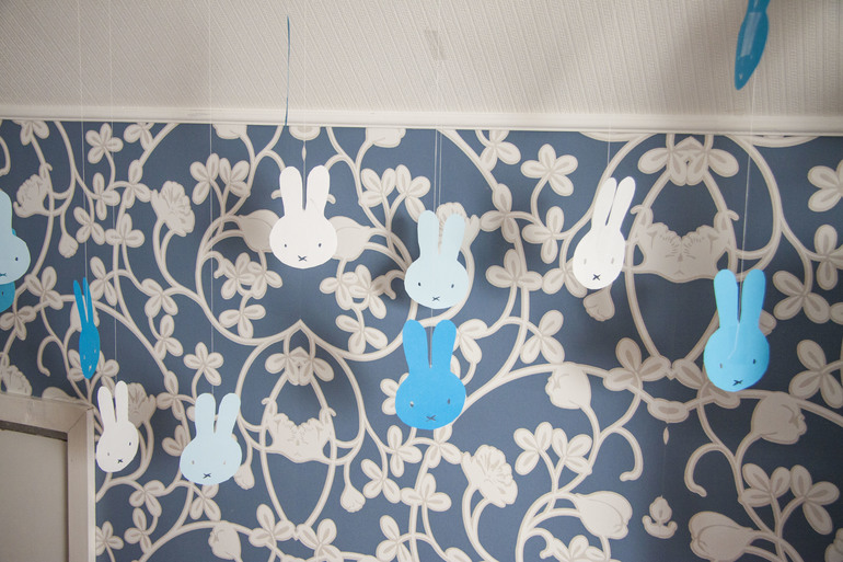 В спальне вырезанных кроликов прикрепила к ниточке и повесила под потолком, но у нас мансарда поэтому получилось низко.