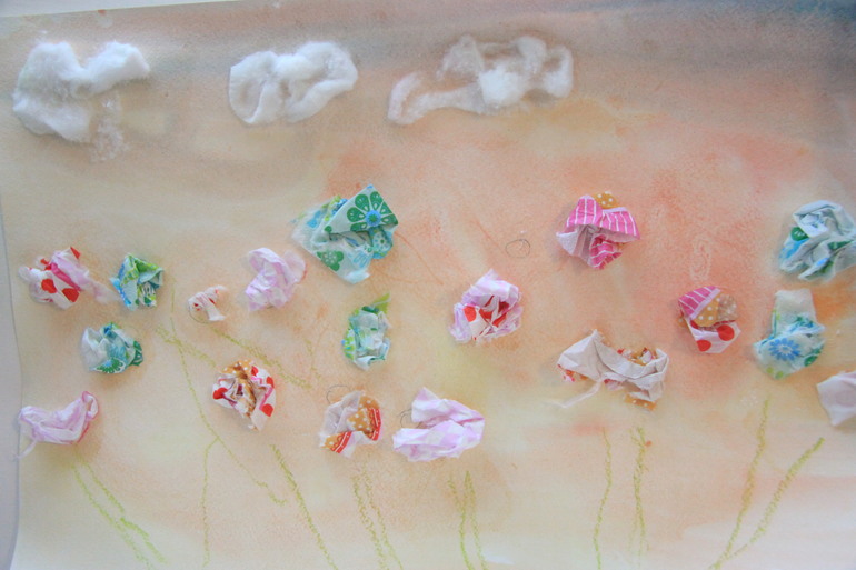 Ростик их нарвал, сделали фон акварелью (я заранее нарисовала кружочки карандашом где будут будущие цветы). Далее когда бумага подсохла я дала рваные салфетки, чтобы он их скомкал, после чего мы их приклеивали туда гдже были отмеченные кружочки. Ну а потом сынок рисовал восковым мелком стебли. В завершении мы приклеили небо из ваты