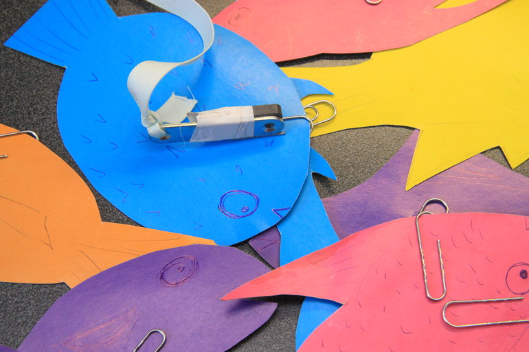 Цветной картон, магнит, палочка, скрепки и вуаля ... радости нет предела...