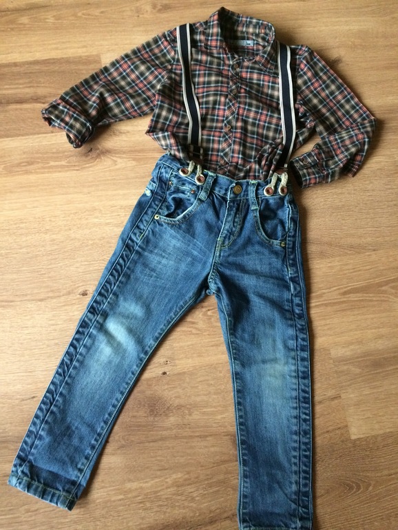 Джинсы с подтяжками ZARA плюс рубашка BONPOINT на 4 года,за все 1000 руб