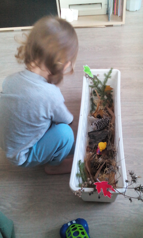 Итак, занятие на тему осень. Для начала была сделана "сенсорная коробка" - коробка с сухими цветами, веточками, сухими листьями, цветами бессмертниками, шишками, картонными грибами и листьями. В лесу гуляла лисичка, искала что можно покушать))