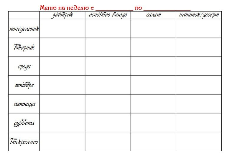 Потом я стала заполнять вот такую табличку на неделю. Но я заполняю только одну графу, т.к. завтракаем мы в разное время и не всегда успеваем. И напиток/десерт посчитала пока не нужным, потому что мы пьем чай ведрами)))) Хотя вот десерты бы надо начать писать, чтобы ориентироваться хотя бы в количестве фруктов, что мы съедаем.