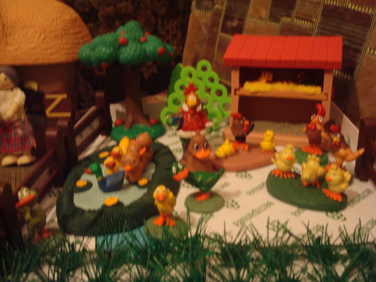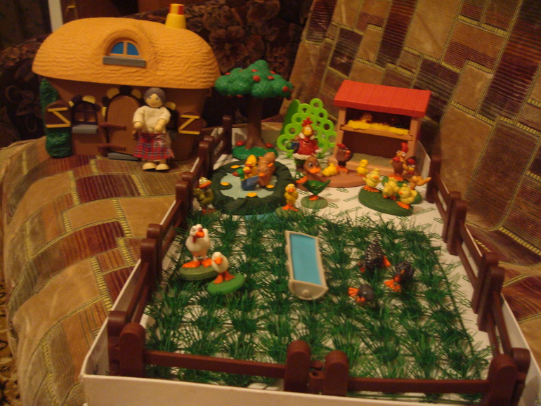 Приехали в деревню, нас встретили баба и деда(деревянные игрушки фирмы "Винтик и Шпунтик") показали сказку, Димка усиленно помогал деду бить яйцо молотком,потом вытащила на птичий двор, поиграли. Тут же повторили цвета, посмотрели коричневый мешок, нашли какие птицы во дворе коричневого цвета. Поклеили