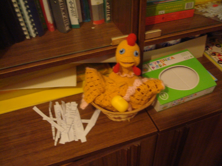 Уже вечером составляли семьи, искали яички, нашли, потом искали маму курицу, нашли и усадили ее на яички, чтобы высиживали. Добрались до ножниц, учились резать ножницами длинные полоски-"солому".