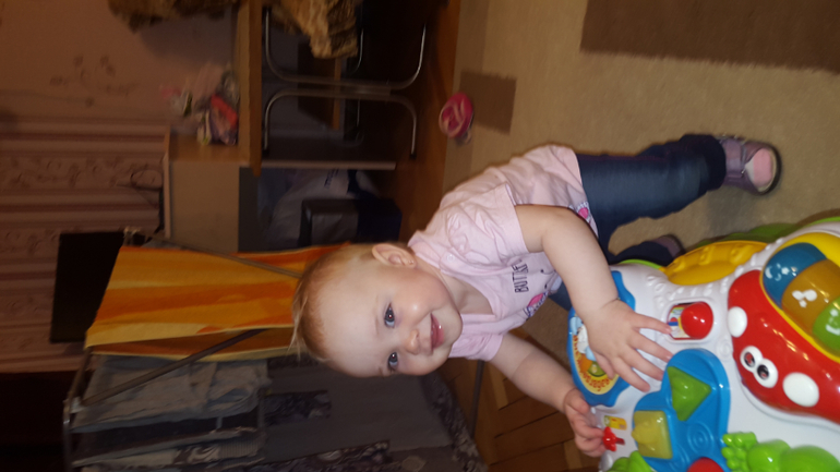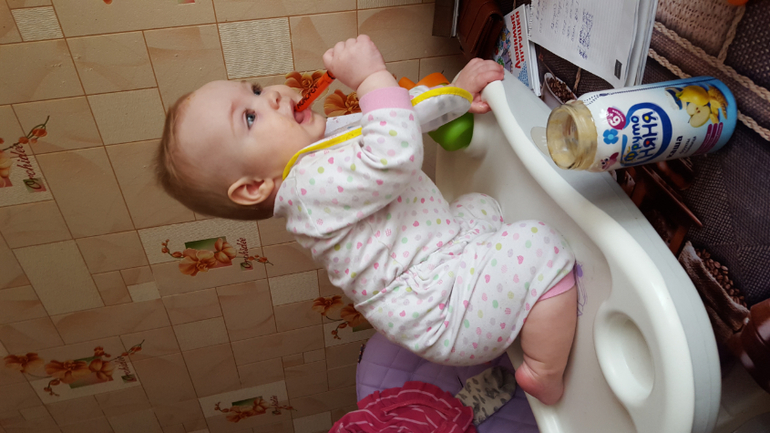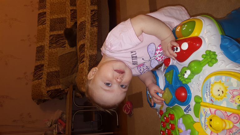Игрушками играет не много, любит листать книжки, смотрит мультики тини лав,колобок,малышарики- я могу хоть что-то сделать в это время- чай попить,посуду помыть... из кресла своего умеет вылезать - ревет когда пристегнутая- кричит чтоб выпустили!