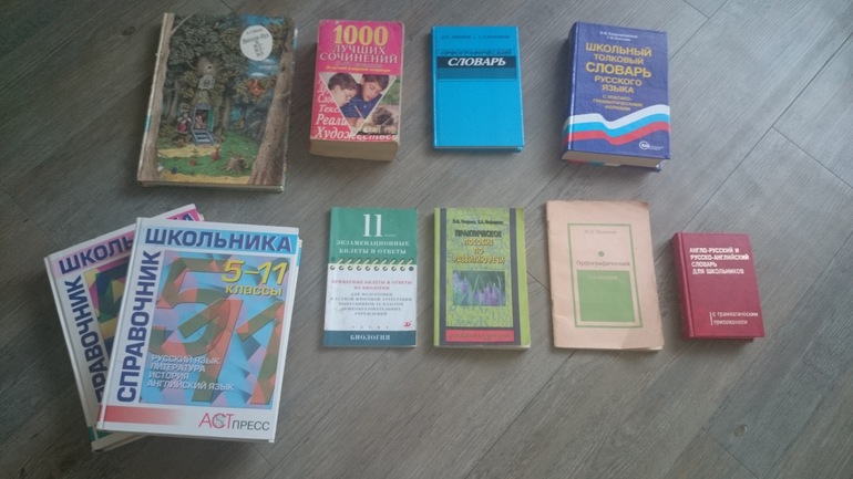 Книга для деток Винни-Пух и все все все в твердом переплете(300), 1000 лучших сочинений 5-11 классы по русской и мировой литературе(450), орфографический словарь Д.Н. Ушаков и С.Е. Крючков(150),школьный толковый словарь русского языка (700), справочники школьника 5-11 классы(600),экзаменационные билеты ответы по биологии(150), пособие по развитию речи для начальной и средней школы (200),орфогрфический словарик (170), англо-русский и русско-английский словарь для школьников (350), журналы все о вязании(100), файлы упаковкой(200), папки с файлами(70шт), папки с зажимом(70шт), папки конверты (упаковка 200), упаковка карандашей новая (100), ежедневники недатированные с позолоченными страницами в кожаном переплете(2000), недатированные ежедневники(600)