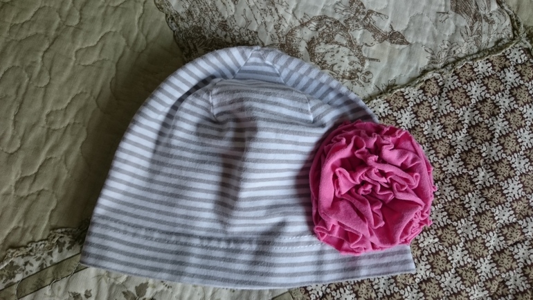 5. Трикотажная шапочка в серую полоску с розовым бантиком. Размер 45-47 см. Цена 100 руб.