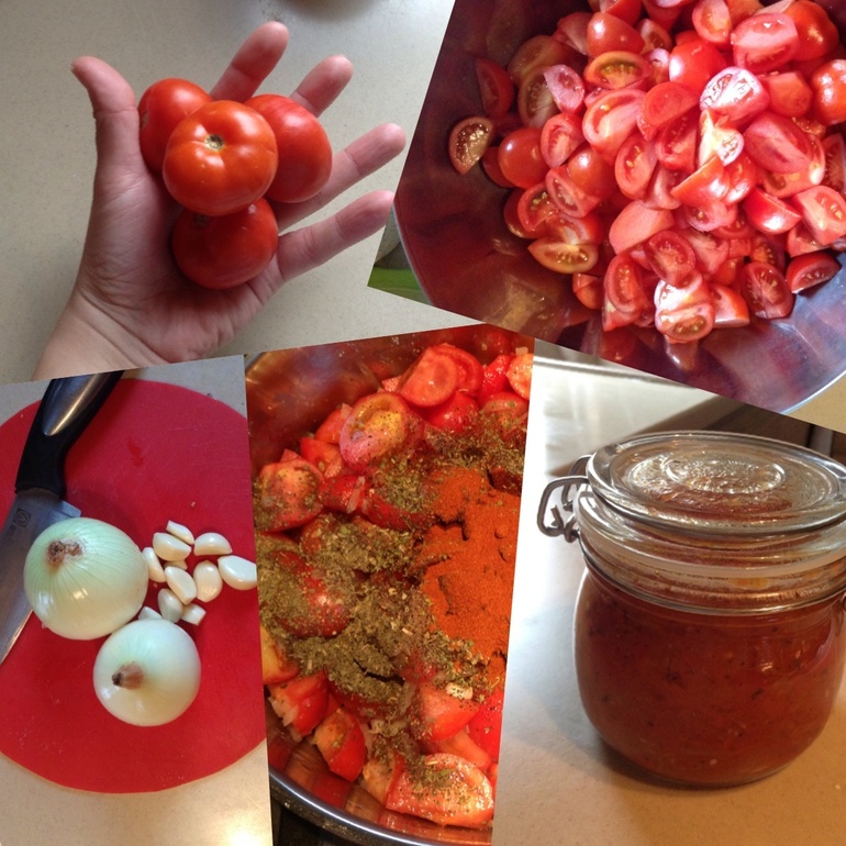 А по другому и не скажешь,- быстро, без лишних движений и слов я расправилась с малышами помидорками... Эээх... На прошлой неделе ездили в Тверскую область к родственникам и собираясь домой, наш багажник пополнился всякой всячиной из огорода нашей любимой тети Зины, а иначе никак, она бы не отпустила нас в мегаполис без мешка картошкисвеклыморковки и блаблабла)))) конечно, где ж в Питере возьмешь картошку?! В догонку ко всему нам был закинут пакет помидоров... Пфффф, ну если картошка и морковка сами знаете, некоторое время могут находится без внимания их поедателей, то помидоры не особые долгожители и уже начали проявлять свой тухленький характер по приезду домой, начали жухнуть, ну в целом не собирались быть съедеными!!! Шо ж с вами делать паразиты?! И поглотить пакет томатов в один присест никто не сможет и смотреть, как они медленно, но верно превращаются в органическое удобрение тоже не хотелось, - выход один, подумала я, сделать томатный соус ко всему чему угодно, и была совершенно права, ведь так они не будут давить на глаз своим жалостливым видом и сгодятся в своем перерожденном виде!))) итак, их исход был решен! Не теряя ни минуты, преступник схватился за нож и нанес несколько ножевых ударов по помидорам, не забывая расправиться с их плодоножками, в итоге получилась целая миска расчлененки из томатов, дальше все как в тумане, под руку попались две луковицы и головка чеснока, которую преступник безжалостно раздел и порубил!!! Ну а далее пришлось прятать следы преступления, в кастрюлю, где уже разогревалось растительное масло, полетели порубленные лук и чеснок, как только они начали источать запах, следом на них полетели порезанные помидоры... Чтобы припорошить следы расправы преступник схватил приправы и засыпал жертв базиликом, солью, молотым перцем и паприкой.... Осталось выжидать, когда под крышкой жертвы переродятся в соус... А ждать пришлось не долго, каких то 40 минут... Погас огонь плиты...
