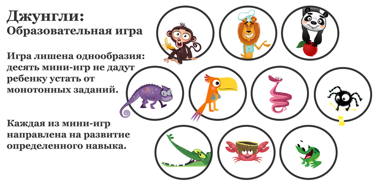Основная задача игры - познакомить ребенка с окружающим миром, показать красоту природы далеких джунглей, развить его фантазию. Поощрительная анимация после каждого выполненного задания станет неплохой мотивацией.