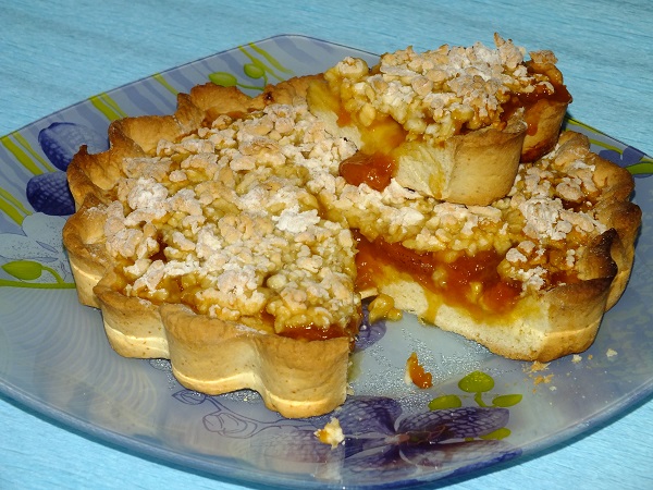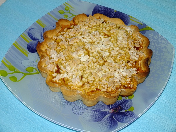 Достаем из холодильника оставшийся кусочек теста и трем его на крупной терке, периодически пересыпая мукой. Выкладываем получившуюся крошку сверху на наш пирог.