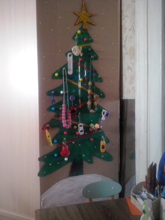 основную елку еще не ставили,а эту делали вместе (красили в зеленый цвет, вставляли "грибочки" из мозаики, наряжали и приклеивали снежинки, сделав их дыроколом)