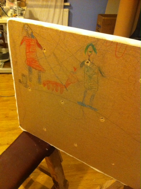 Лист ДСП у меня был вот такой веселый, спасибо детям :) Обшиваем его поролоном.