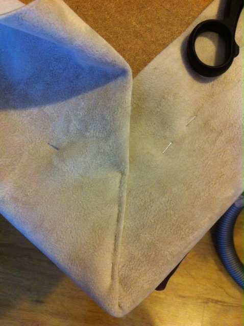 Ткань наживляем на изделии, положив ее изнаночной стороной и прицепив уголки булавками, т.к. конструкция симметрична.