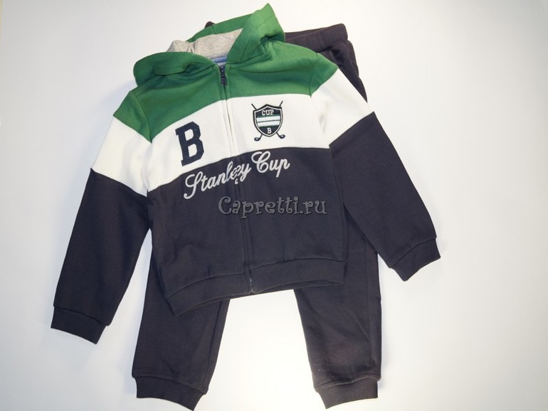 Тепленький хлопковый спортивный костюм MAYORAL. Толстовка трехцветная: белая, темно-синяя, зеленая полоса; с карюшоном, на молнии. Рукава с манжетами. Внутренняя сторона курточки и штанишек на баечке. Штанишки темно-синего цвета на широкой резинке с зелеными завязочками. В таком костюмчике малышу будет тепло и удобно играть на свежем воздухе.