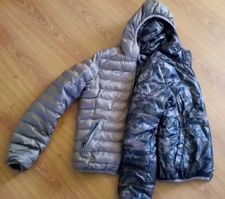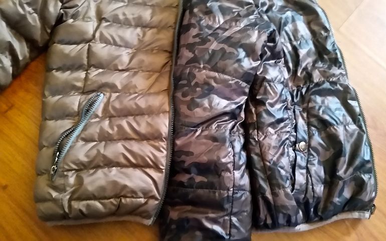 Двухсторонняя куртка. Очень симпатичная. Есть изъян, зацепка возле кармана. Пишут 15/16. Маломерка. На рост 152.