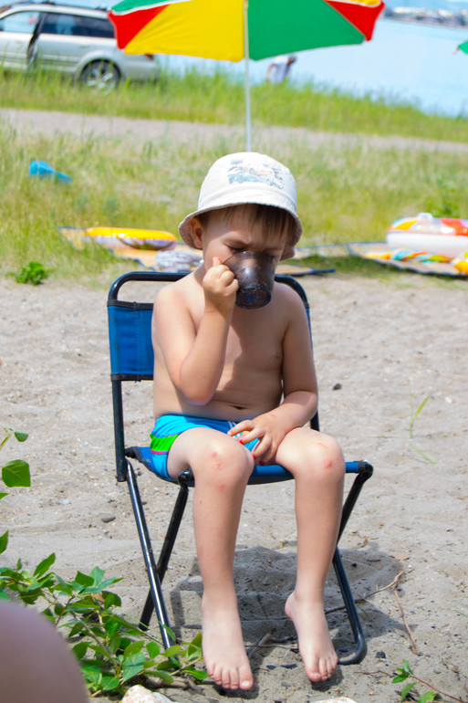 Наплюхался, напрыгался в воде, а аппетит то сразу какой у него разыгрался, а то все выбирает то буду, другое не буду, а здесь ел с привеликим удовольствием.