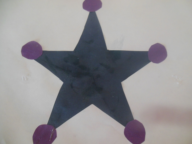 и сделали вот такую предложенную Вами звездочку.Только у нас и в первом и во втором случае не наклейки,а кружки из цветной бумаги и клей-карандаш.
