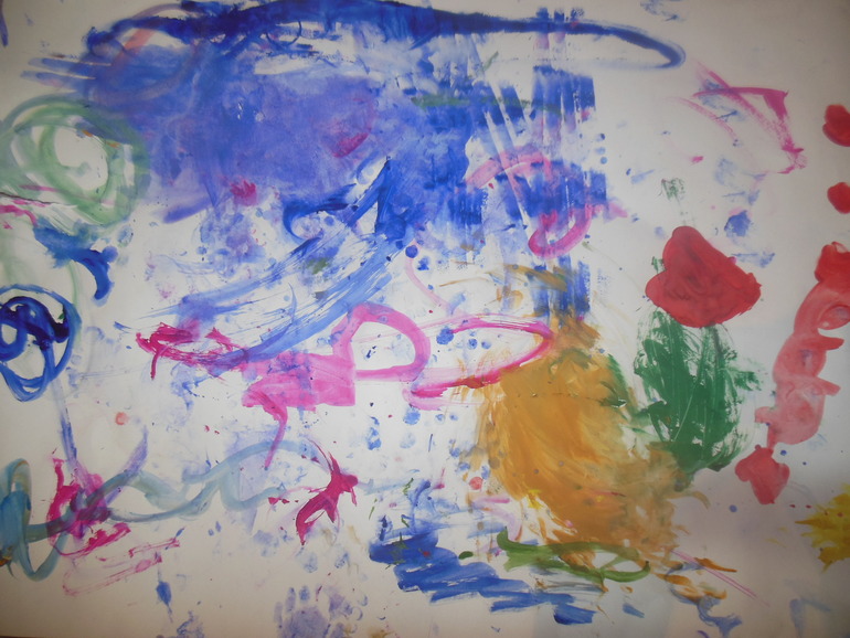 К сожаление,в наших канцтоварах нет и не бывает чёрного ватмана,купила я белый и мы порисовали!Дочка была счастлива!Начала рисовать кисточкой,потом валиком,потом руками и ногами!Вот что у нас получилось!