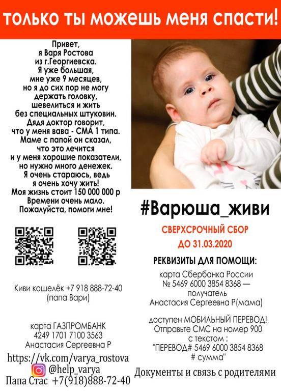 Добрый вечер!Девочки,мамочки,чудесницы,этой малышке которую зовут Варечка срочно нужна наша помощь!Это не спам и не мошеники!О Варюше рассказывали по ТВ.