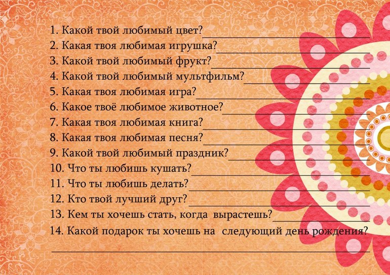 Вот список примерных вопросов, вы можете придумать или дополнить их сами: