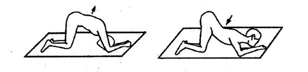 Пациент стоит на коленях и локтях. Локти опираются о пол на уровне головы. На вдохе спина выгибается кверху (кифозирование), голова упирается в пол, на выдохе - спина прогибается вниз (лордозирование), голова, отрываясь от пола, разгибается до горизонтали. Прием повторяется 5-7 раз.
