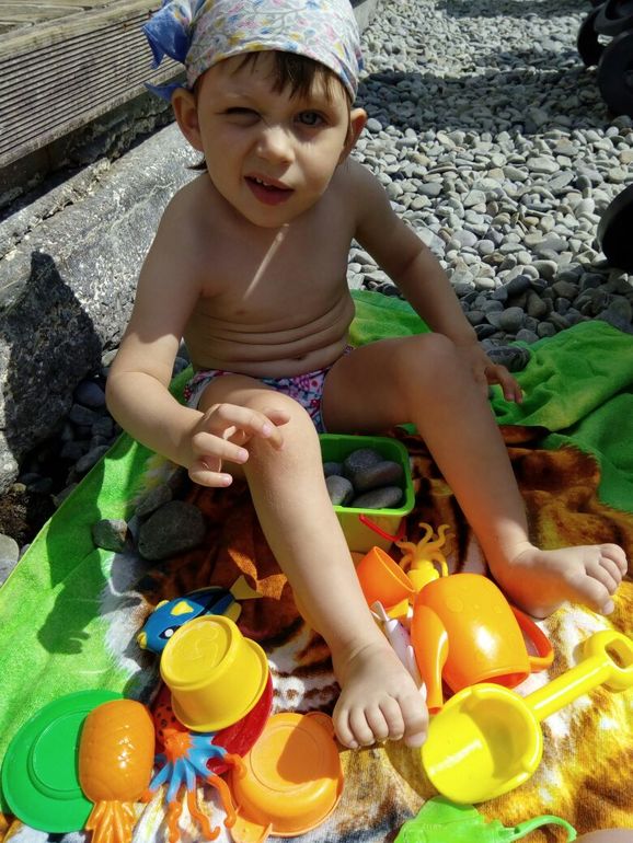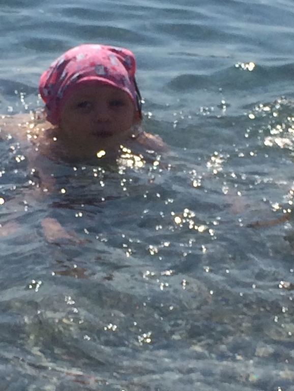 Маруся была в восторге от моря - вылезать из воды отказывалась наотрез. Вытаскивали - показывала рукой обратно, пыталась надеть на голову круг.