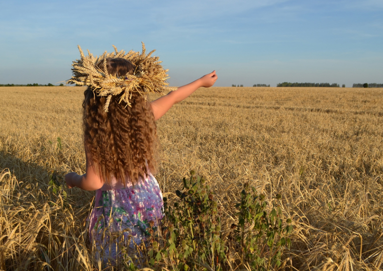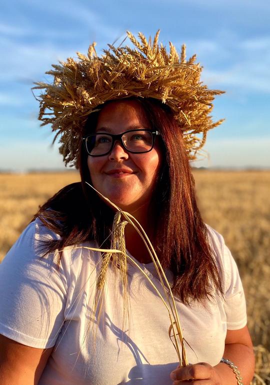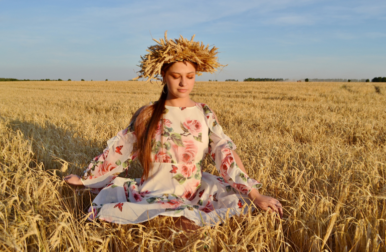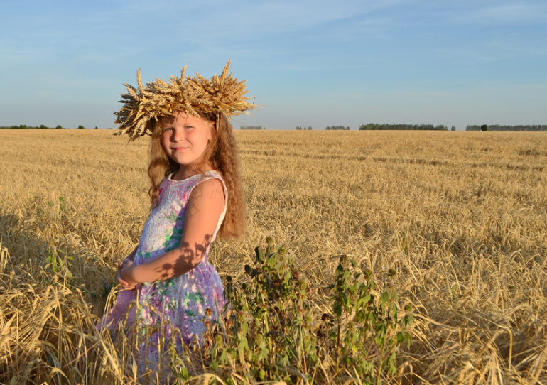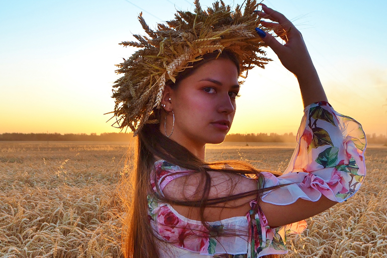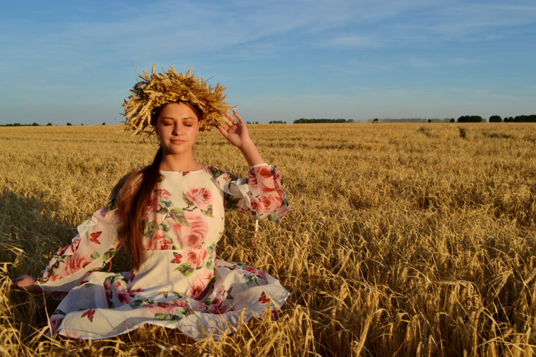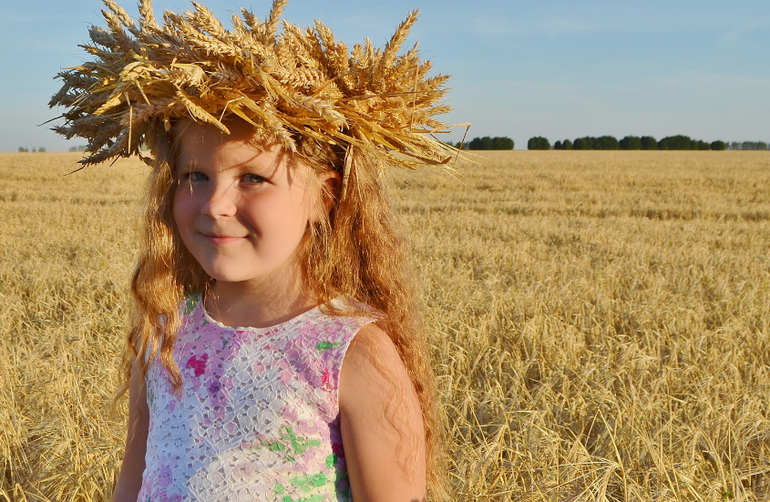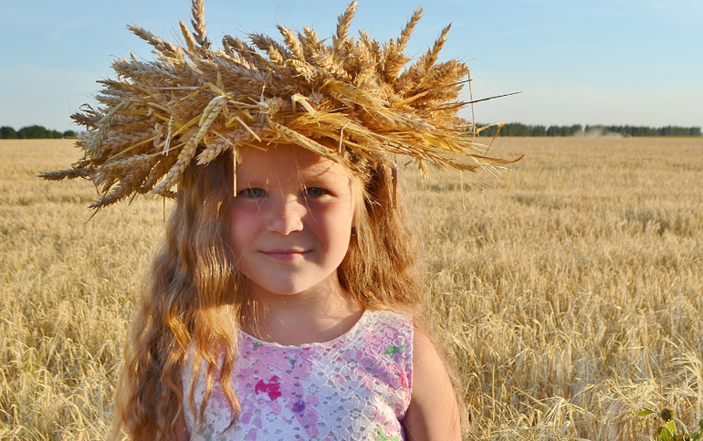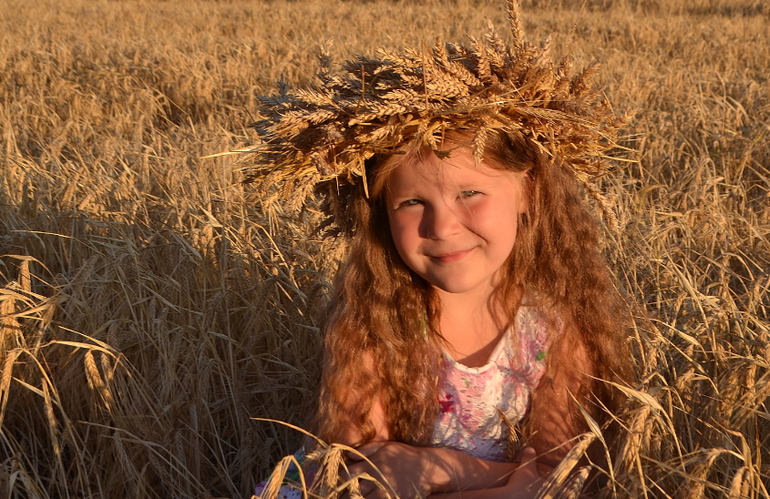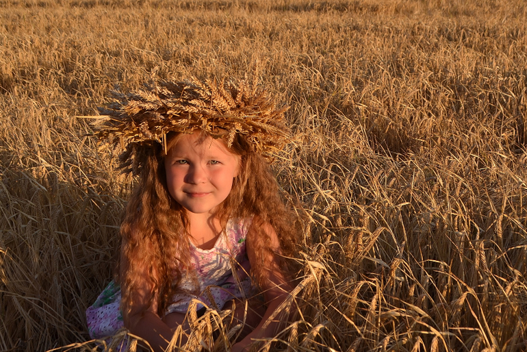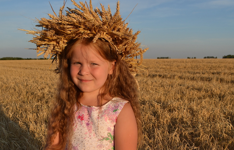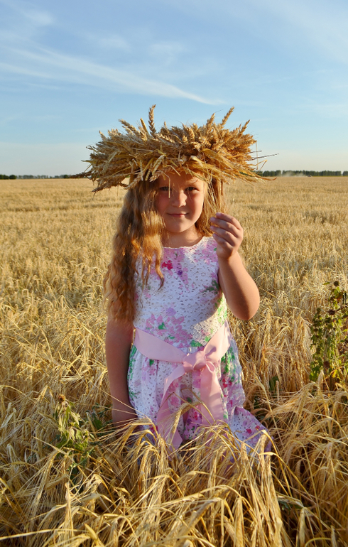 а венок из колосьев... это та еще ипапея... сначала я сплела рожь, но получилось жиденько и хлипенько. да еще и норовило развалиться. пришлось скреплять венок проволокой. а потом обрезать пшеницу и нашпиговывать ей венок. если решусь на следующий год делать, то сразу сформирую заготовку из соломы, закручу намертво проволокой местах в 5-6 и уже в эту основу буду вставлять колосья