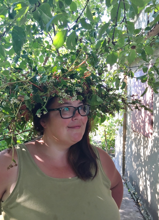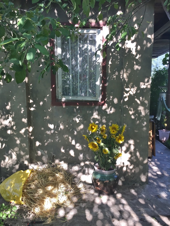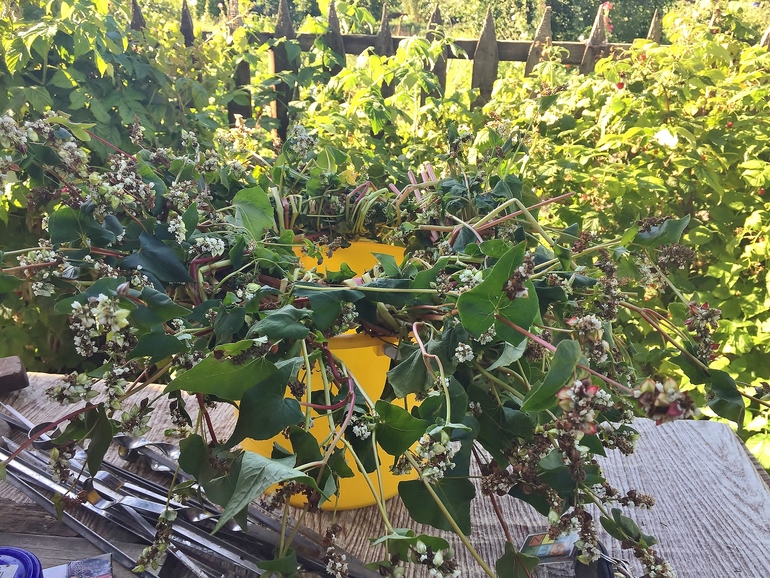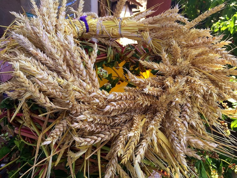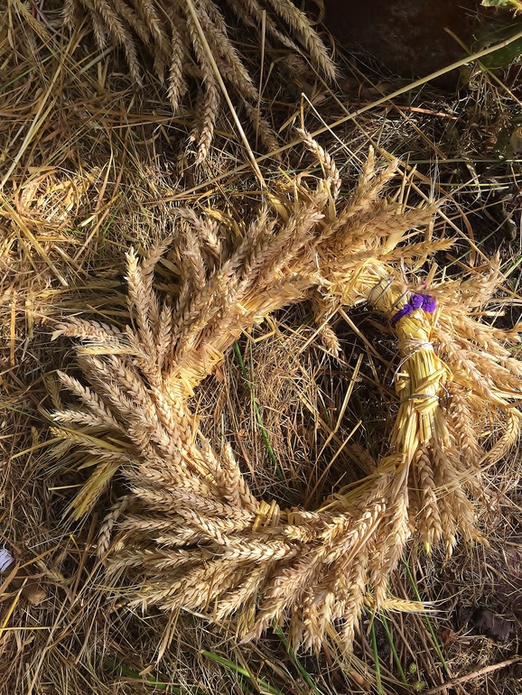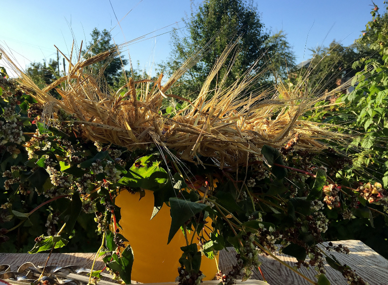 в первую неделю оседлали Кота и поехали в деревню на родовое кладбище - прибраться и проведать. по пути назад я полезла в поля и нажала пару снопов пшеницы и ржи. а еще подсолнухов наломала и гречки нарвала. и стала думать как из всего этого богатства соорудить венки. гречка оказалась недолговечной и венок, даже завернутый в мокрую простыню, завял.