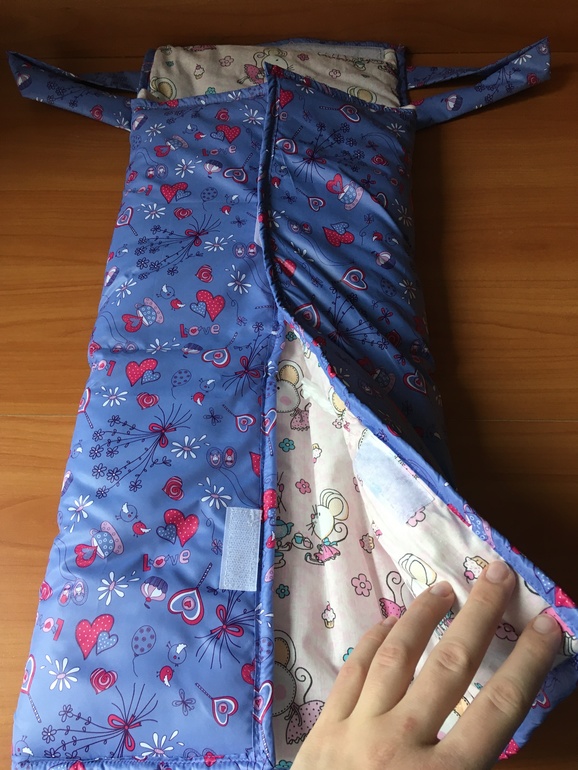 Сверху ткань непромокаемая плащевка. Внутри 100% хлопок, наполнитель синтепон (мягкая). На липучках.