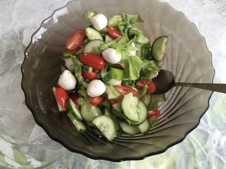 Затем укладываем в сплатницу свежие листья салата, овощную смесь, поливаем соусом.