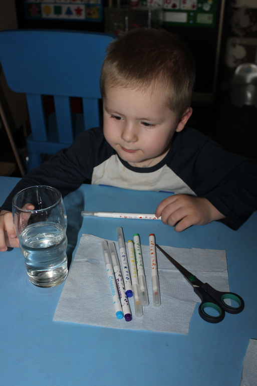 Вода начинает подниматься вверх по салфетке,разнося краску,что приводит к появлению красивой радуги!