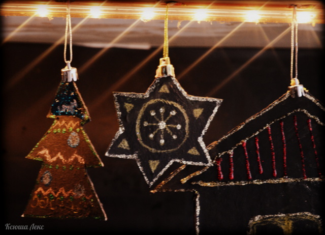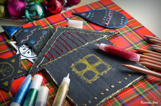 Сегодня, мы делали необычные елочные игрушки, на которых можно рисовать мелками и карандашами (получился аналог грифельной или меловой доски).