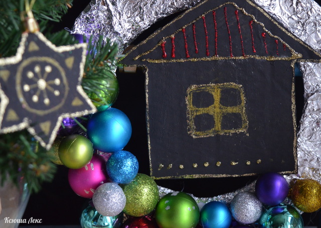 Такими самодельными игрушками, можно украшать елочку. Кстати, если рисовать мелками для асфальта, а потом протирать чуть влажной тряпочкой эти игрушки, то можно снова наносить рисунок. Или сделать специальную табличку и писать послания от Деда Мороза (но полностью, меловую доску, этот вариант не заменит, зато эффект создаст:)!