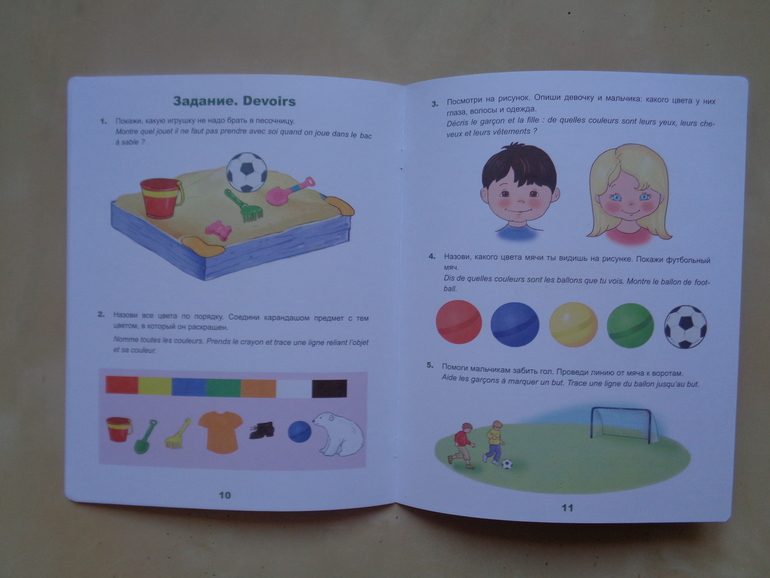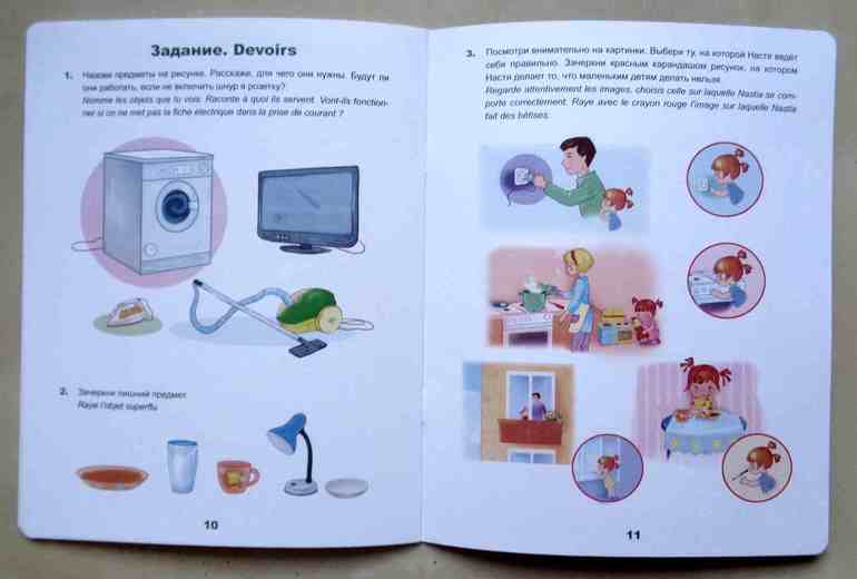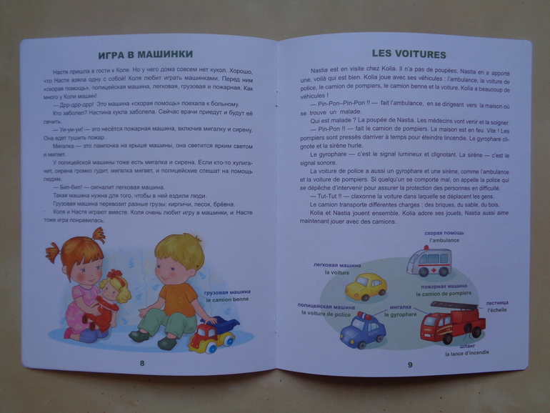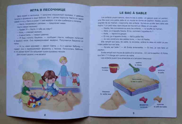 На сегодняшний день серия представлена четырьмя книгами: «Настя и игрушки», «Настя и зима», «Что Настя умеет делать?», «Почему нельзя?» Книжечки тонкие, по двенадцать страниц, мягкий глянцевый переплет (прочный), закругленные уголки (удобно для малышей). В каждой книжечке содержатся четыре рассказа на тему повседневной жизни девочки Насти возрастом примерно два-три года. (Если сравнить с книгой «Жил-был Сережа», то это определенно первая книга, только рассказы короче.) Книги написаны для детей-билингвов, отсюда каждый рассказ на русском языке дублируется переводом на французский (левая страница - русский текст, правая - французский.) Перевод выполнен носителем языка. Текст занимает половину страницы, внизу - картинки по теме рассказа с подписями на двух языках. В конце каждой книги - несколько заданий (лабиринты, найди отличия и др. - на возраст 2-3 года, моя дочка сейчас как раз любит пальчиком линии проводить, находить отличия между рисунками и пр.)