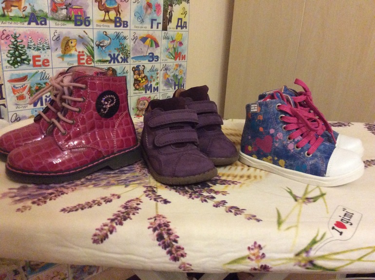 Обувь вся абсолютно новая, кроме 2 пар слева на фотографии: туфли Паблоски темно-синие с цветами ( носили только в саду, на улице ни разу не были) 1100руб